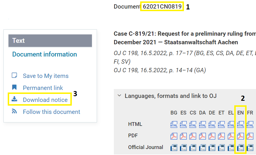 - For each publication page, EUR-Lex includes a link to retrieve from Cellar the XML notice associated to this publication (see metadata notices for details).