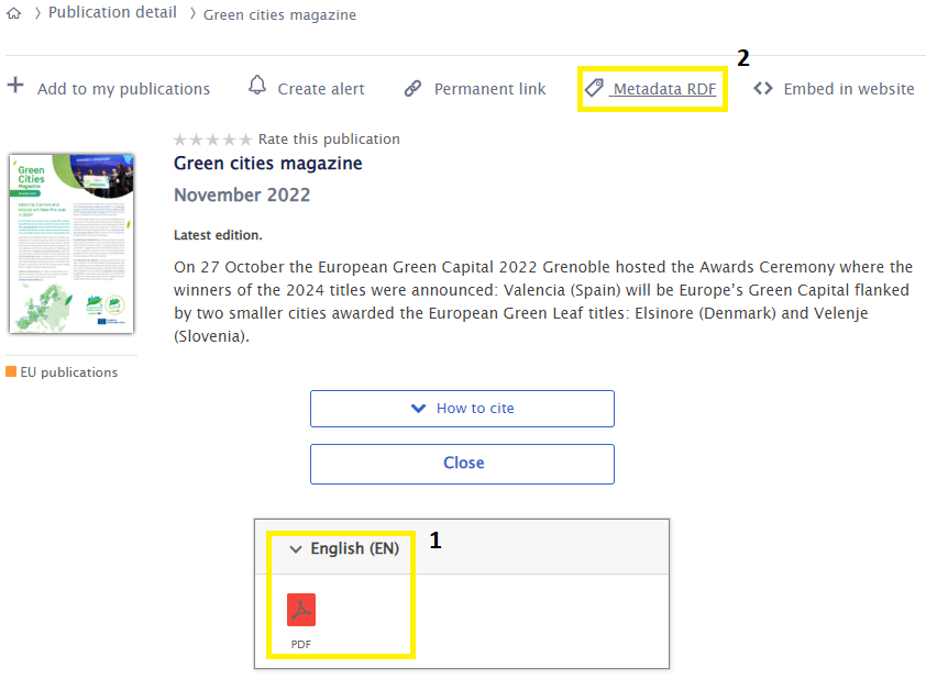 - For each publication page, OP Portal includes a link to retrieve from Cellar the RDF notice associated to this publication (see metadata notices for details).