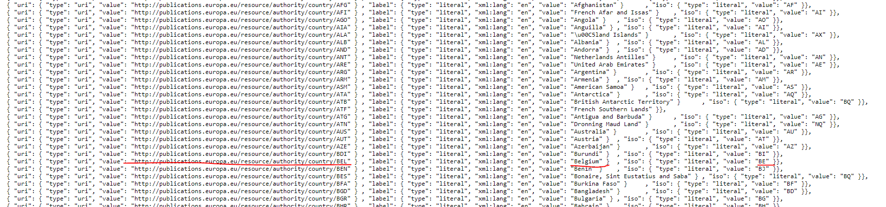 - http://publications.europa.eu/resource/authority/country/BEL - it is an RDF/XML response with detailed information on country with code "BEL" (Belgium)