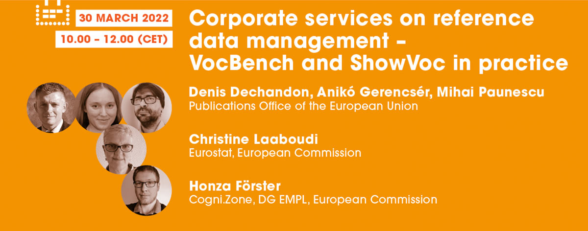 The webinar will start with the presentation of the corporate reference data management services offered by the Publications Office, followed by two showcases presented by users from the European Commission (DG ESTAT and DG EMPL) who will speak about their experience of using VocBench and ShowVoc in practice. The third part of the event will provide a short demo of both tools and give the opportunity to participants to ask questions.